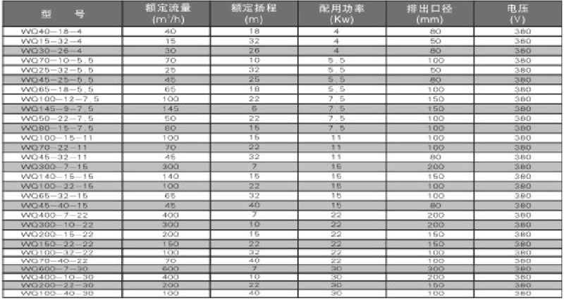 WQ系列电泵技术性能参数表
