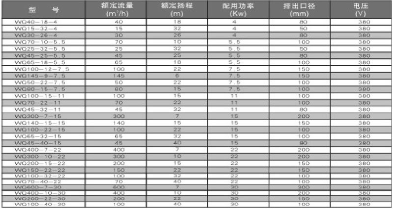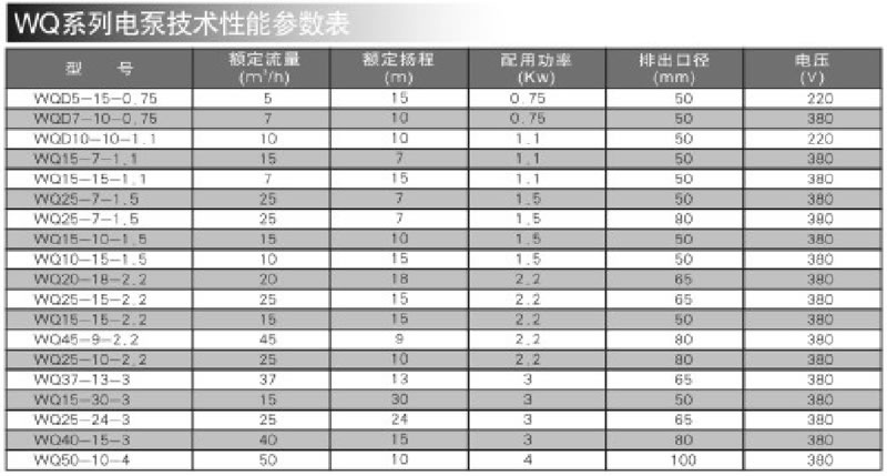 WQ系列电泵技术性能参数表